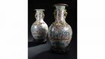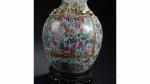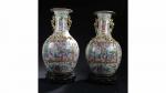 CANTON. Paire de potiches en porcelaine à décor polychrome, Chine vers 1800. H. 42 cm (fêle à l'un, éclat au talon de l'autre). Sur socle bois (manques)