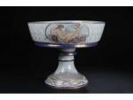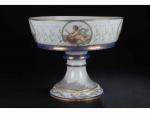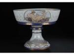 COUPE (importante) centre de table circulaire sur piédouche en porcelaine de Sèvres à décor de scènes de la mythologie marine dans des réserves et rehauts de dorure. Marquée 1864 (dans la coupe et sous le piédouche). H. 37,5 cm - Diam. 45,5 cm