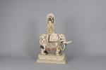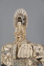 CHINE, 20ème siècle. STATUETTE d'ELEPHANT en os et placage d'os sculpté et incisé surmonté d'une divinité. H. 62 cm - L. 38 cm
