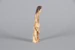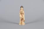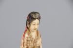 JAPON - Epoque MEIJI (1868 - 1912) Okimono en dent de morse polychrome, jeune femme debout. H. 17,3 cm. Expert : cabinet PORTIER