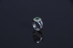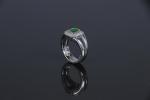 BAGUE en or gris 18k à deux brins ajourés, le chaton à pans coupés serti d'une émeraude entourée d'une ligne de quatorze petits brillants. Poids brut : 13,9 g - TD : 47 (anneau intérieur avec boules de réduction)