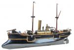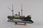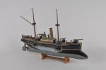 RADIGUET - Canonnière cuirassée à éperon, zinc et métal, vapeur vive. Bulbe d'étrave surmonté du sphinx ailé, figure de proue tenant lieu de signature, vers 1905. H. 36 - L. 56,5 - l. 12,5 cm. Très bel état. La couleur noire semble d'origine, mais la couleur grise a été repeinte et à recouverte la couleur or d'origine, quelques accessoires rapportés