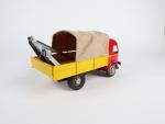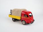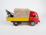 C.I.J. (Briare, 1956) camion Renault Galion dépanneuse bachée, tôle laquée rouge, ridelles jaune d'or, L : 34cm, moteur à ressort , état B.o