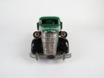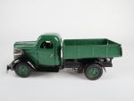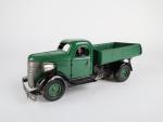 VéBé (Paris, v.1950) camion Fargo benne basculante en tôle laquée vert sapin, chassis noir, moteur à ressort fonctionne, L : 33 cm bon état B.c