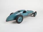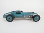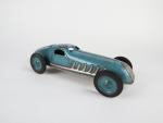 JEP (Paris, v. 1935) réf 7480 voiture de course carénée, en tôle laquée bleu, L : 37cm, bon état, sautes de peinture, moteur à ressort