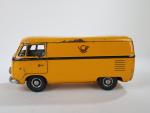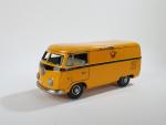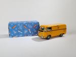 TIPPCO (Allemagne, années 50) Volkswagen Bulli Deutsche Bundespost, en tôle lithographiée jaune d'or, L : 23cm, friction frictionne, état d'usage C.b on y joint un étui carton reproduit