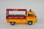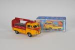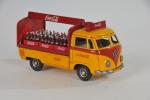 TIPPCO (Allemagne, années 50) Volkswagen pick-up COCA-COLA, en tôle lithographiée jaune d'or/rouge, L : 23 cm, friction fonctionne, complet de ses casiers à bouteilles, état A.b on y joint un étui carton reproduit