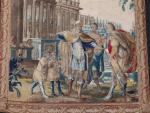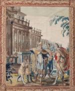 BRUXELLES, 17ème siècle "Personnages dans un parc sur fond de palais", tapisserie. 264 x 228 cm (restaurations et bordure postérieures, doublée)