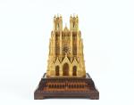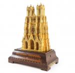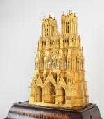 PENDULE à la cathédrale de Reims en bronze finement ciselé et doré, reposant sur un socle marqueté à fond de palissandre et décor néo-gothique contenant une boite à musique. Attribuée à Bavozet Frère & Soeur. Epoque Charles X. Pendule : H. 47,5 - L. 30,5 - P. 15 cm - Socle : H. 14,5 - L. 45 - P. 25,3 cm.