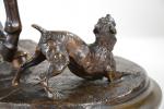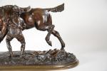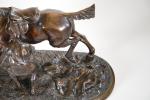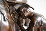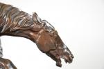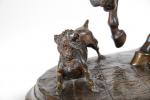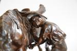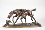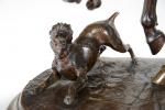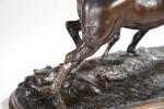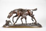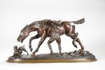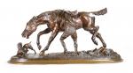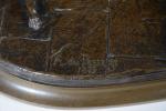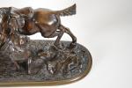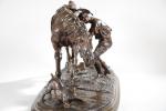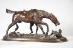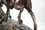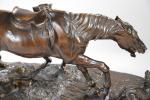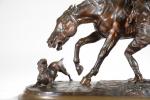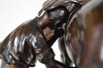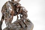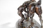 « Lad sanglant une jument ». Bronze à patine brune nuancée, signé sur la terrasse et daté 1872.