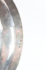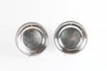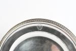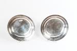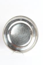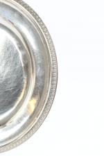 PLATS (paire de) ronds en argent à bordure moulurée et ciselée de feuilles d'eau, monogrammés M.B dans une couronne de laurier nouée. Poinçon de 1809 - 1819. Poinçon de l'orfèvre et marque en toutes lettres de BIENNAIS. Poinçons de recence de 1817 et 1838.
