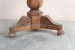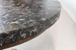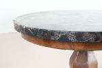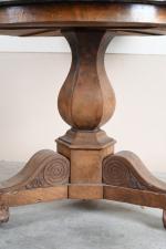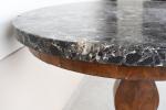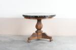 GUERIDON en acajou et placage tripode, fût balustre à pans coupés, base volutes à pieds griffes, épais dessus de marbre. Fin de l'époque Empire. H. 69,5 - Diam. 86,5 (épaisseur marbre. 4 cm) (usures d'usage, quelques éclats au marbre)