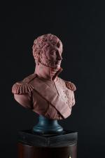 BUSTE (petit) en cire rose peinte couleur crème à sujet de la princesse Caroline MURAT. Il repose sur piédouche de bois mouluré et laqué gris, posé sur une base carrée d'ébène, l'ensemble repose sur une colonne tronquée cylindrique et base mouluré en acajou massif. Chiffre "C" de rinceaux en bronze ciselé et doré à couronne princière ajourée en applique. Cartouche en bas de colonne titré "CAROLINE reine des deux Siciles". Signé à l'arrière dans la cire "Couriguér F.". Epoque Empire. Le tout repose sur une base circulaire en acajou rainuré supportant un globe de verre bombé. H. buste. 11 cm - H totale. 25,5 cm - H avec base du globe. 26,5 cm (Accident restauré au cou et usures. Il est probable que le buste ait été laqué pour masquer la restauration)