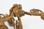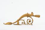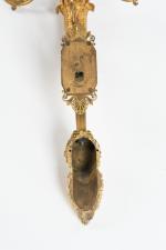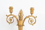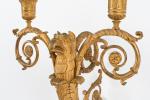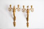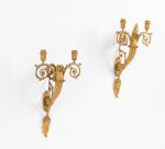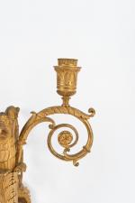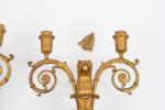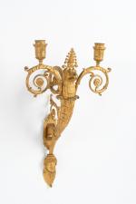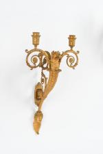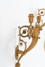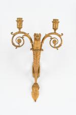 GALLE, Claude vers 1810 (attribuées à). Paire d'appliques à deux lumières en bronze finement ciselé et doré d'entrelacs feuillagés, rosaces, platine à pans coupés et palmettes ; fût à décor d'un griffon émanant d'un bouquet de feuilles d'acanthe et feuilles d'eau et amortissement en forme de tête de personnage de face. Epoque Empire. H. 48 - L. 25 - P. 16,5 cm. (manque la palmette centrale d'une et les barres et chapiteaux reliant les deux binets)