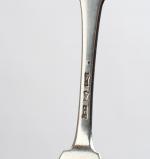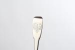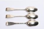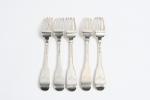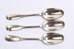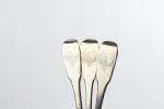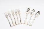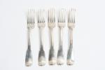 COUVERTS (suite de trois) et deux FOURCHETTES en argente modèle uni-plat. TOURS ? Poinçon de la veuve de Jacques COUTURIER, née Madeleine RENOU, insculpté après 1754. Gravés d'une double armoirie en cartouche rocaille coiffée d'une couronne de Marquis. Poids. 632 g.