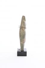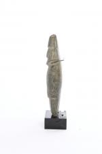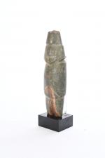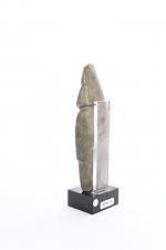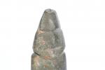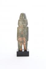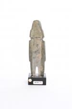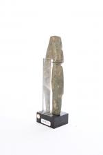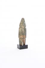 IDOLE (grande) précolombienne en pierre verte typique de la culture Mezcala (type M-10 de la classification de Carlo Gay). Mexique, état du Guerrero. 300-100 av. J.-C. Concrétions. Le haut du crâne est inachevé, comme souvent. H. 23 cm.