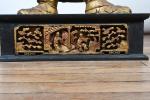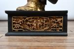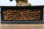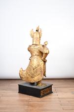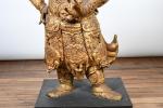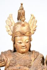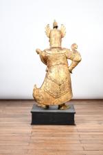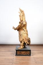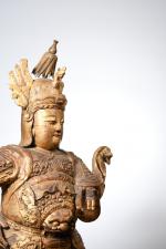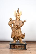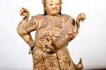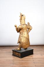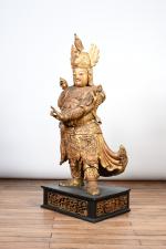 STATUE (Grande) d'un gardien de temple en bois entoilé, laqué et doré. Il est vêtu d'une riche armure avec une fine étoffe flottant entre les coudes et les épaules. Il est coiffé d'un casque amovible. Chine. XVIIème siècle. Accidents (doigts, sommet du casque, etc.), usures, fissures et manques visibles. H. 112 cm + 16 cm (socle).