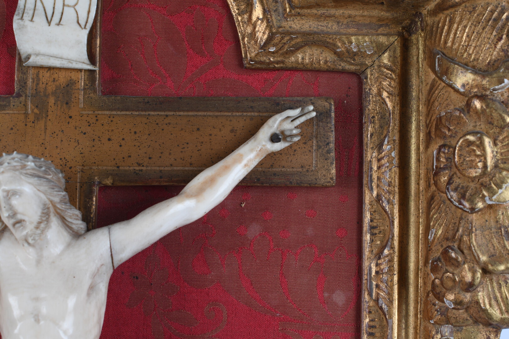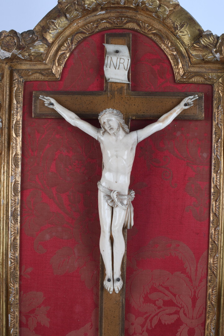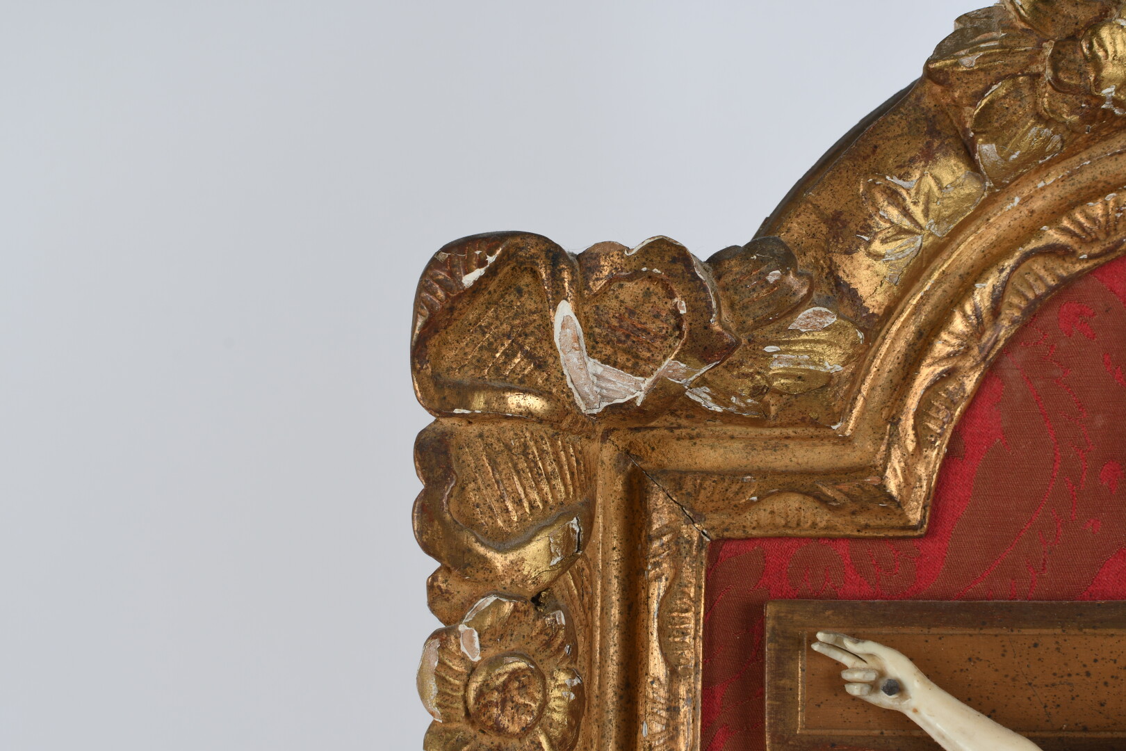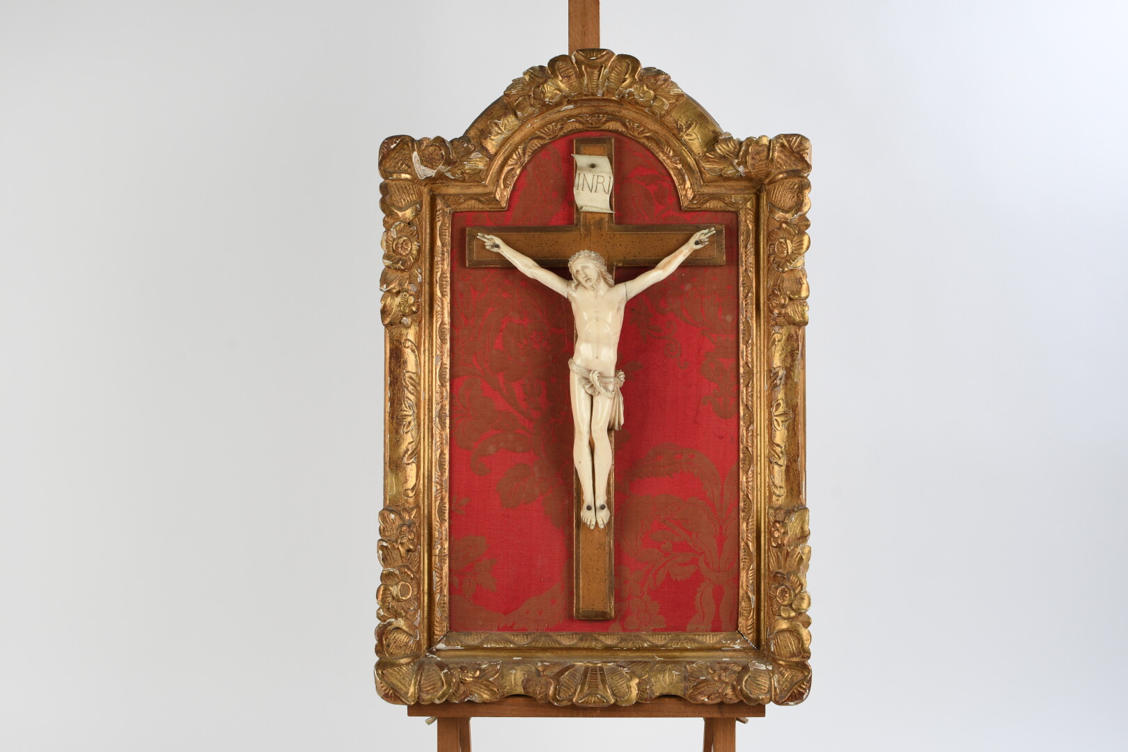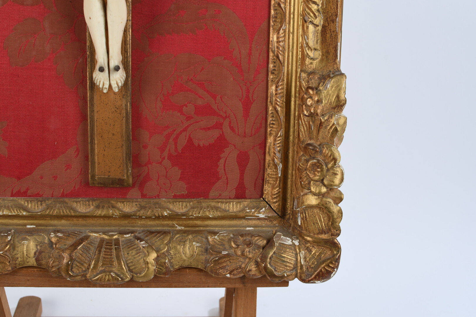 CRUCIFIX en ivoire sculpté, XIXème siècle. H. 25 cm. Dans un cadre en bois sculpté et doré du XXème siècle de style Louis XIV. H. 53,5 cm. (écaillures à la dorure).
