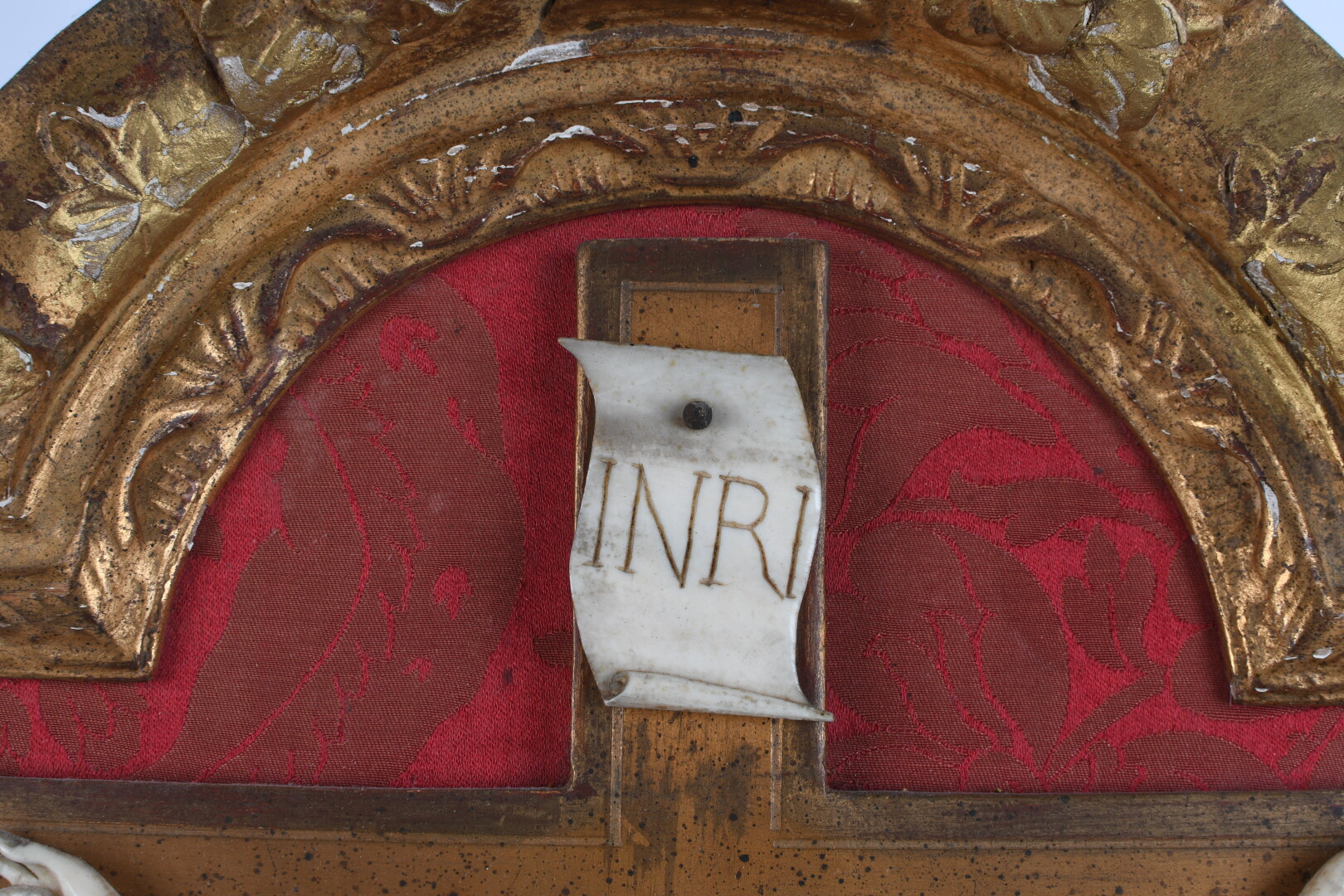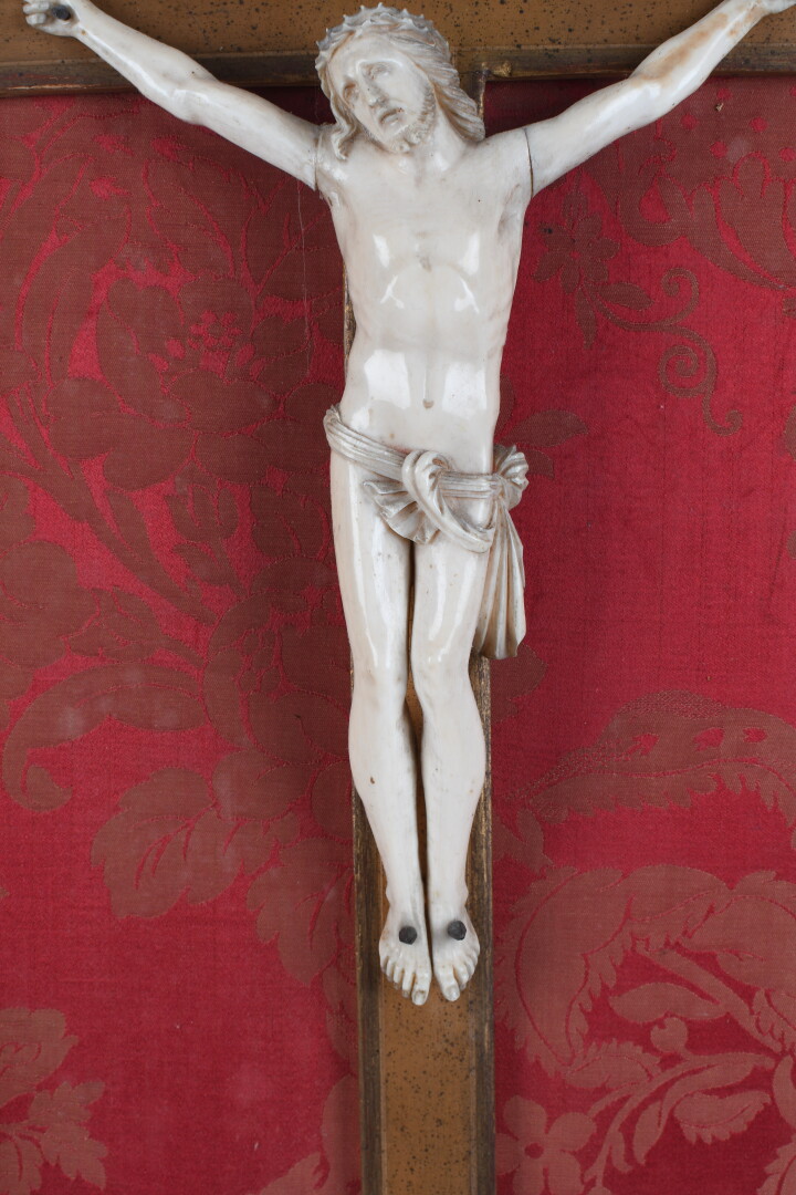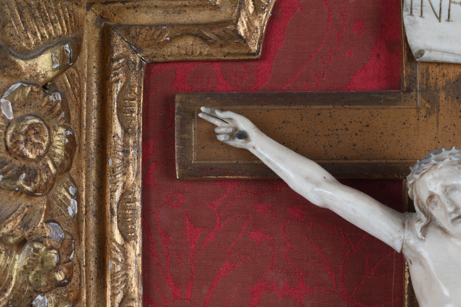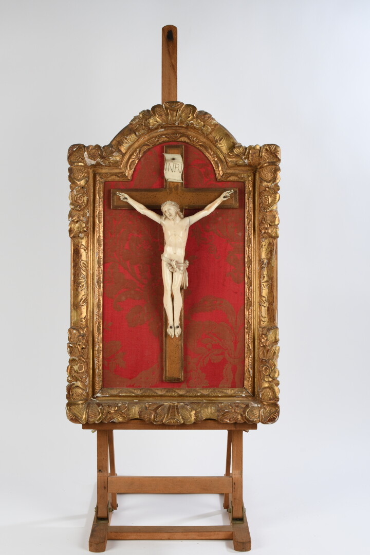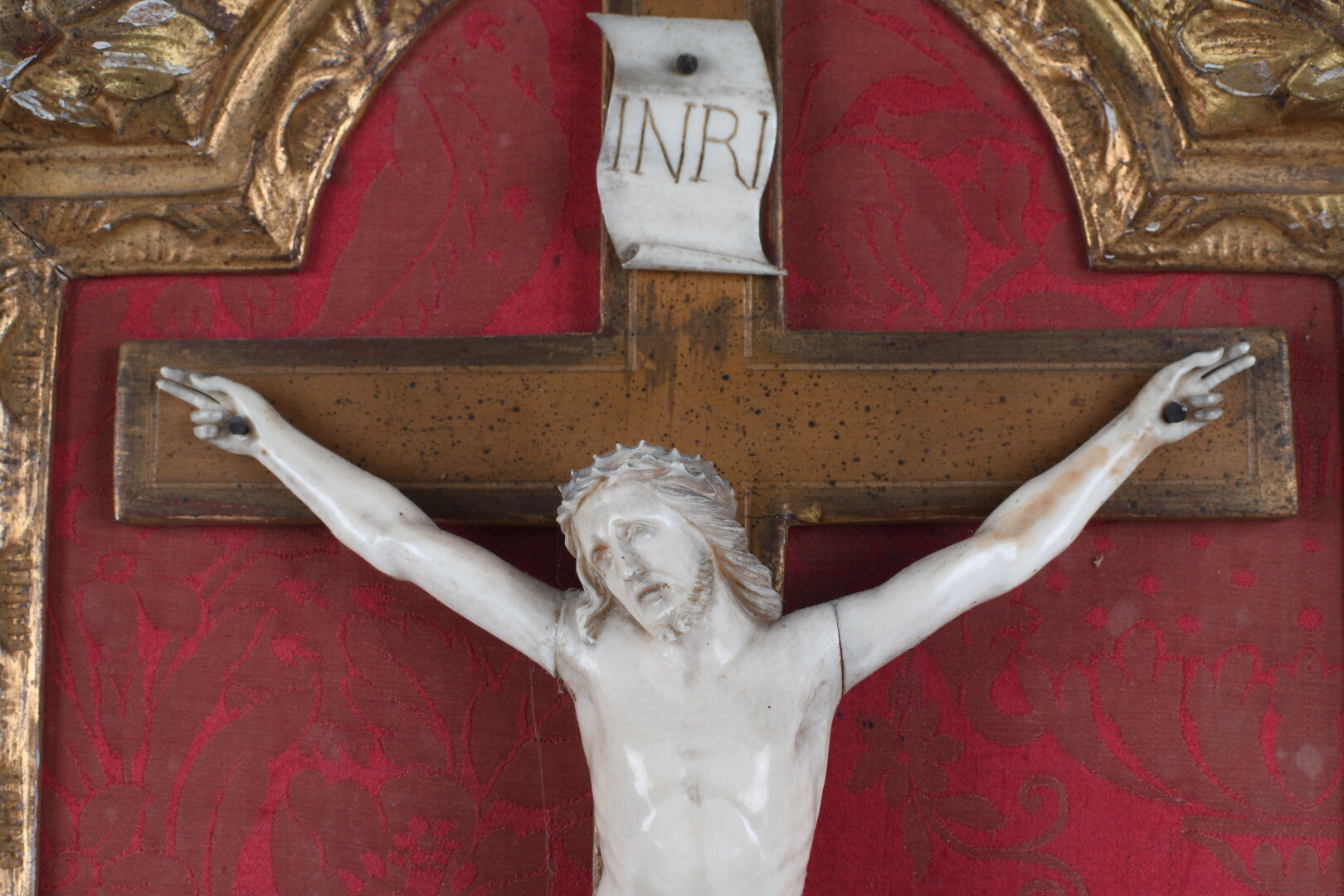 CRUCIFIX en ivoire sculpté, XIXème siècle. H. 25 cm. Dans un cadre en bois sculpté et doré du XXème siècle de style Louis XIV. H. 53,5 cm. (écaillures à la dorure).