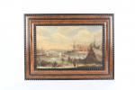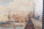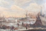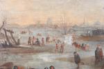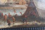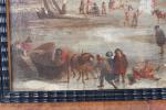 BOUDEWYNS, Adrien Frans (Bruxelles 1644-1711) et BOUT Pieter (Bruxelles c. 1658-1719) (attribué à). "Patineurs sur une rivière gelée", toile. 27 x 41,2 cm (restaurations anciennes) ; on y joint un certificat de M. Claudie Lalande daté du 29 mai 1979