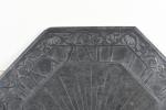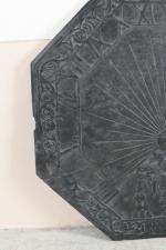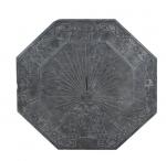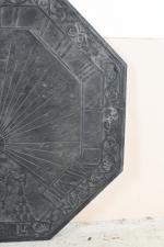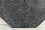 CADRAN SOLAIRE horizontal en ardoise de forme octogonale. Gravé d'armoiries d'archevêque(effacées) et de la devise "Lumine Ducit oves" (la lumière guide les brebis). L'identité qui pourrait correspondre serait Louis Jacques Chapot de Rastignac, archevêque de Tours (1723-1750) né dans le Périgord en 1684 et mort en 1750. Par ailleurs le tracé des heures du cadran a été fait pour la latitude du Val de Loire. (47° L. Nord). L. 70 cm
