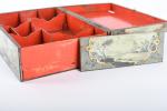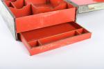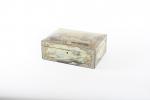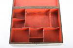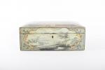 COFFRET peint en grisaille à scène de chasse à courre, ouvrant à un abattant découvrant des casiers, le côté droit coulissant découvrant un tiroir secret. XIXème siècle. H. 14 - L. 35 - P. 26,5 cm. (Petites écaillures, un accroc et tâches)