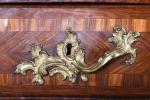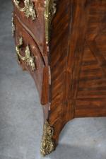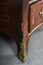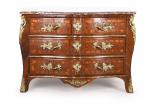 COMMODE arbalète marquetée de bois de palissandre ouvrant à trois tiroirs, ornementation de bronzes...