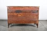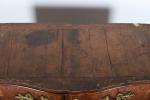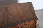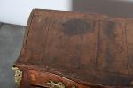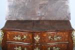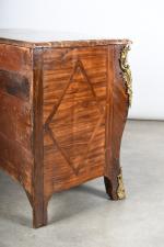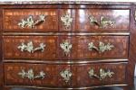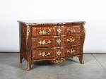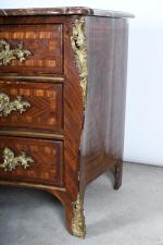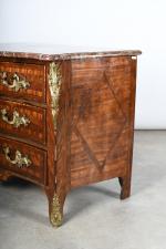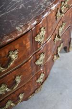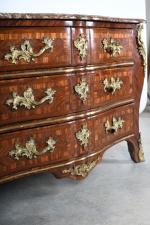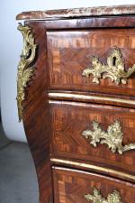 COMMODE arbalète marquetée de bois de palissandre ouvrant à trois tiroirs, ornementation de bronzes et filets de laiton, dessus de marbre rouge des Pyrénées. Epoque Louis XV. H. 86,5 - L. 120 - P. 65 cm. (Marbre restauré)