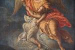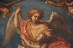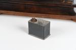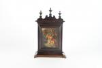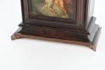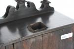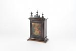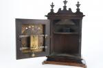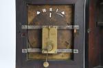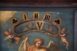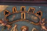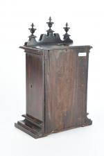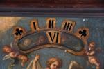 VEILLEUSE à décor d'une plaque en tôle ajourée des chiffres "I II III" et d'une fenêtre montrant les chiffres d'un disque au revers ajouré des chiffres "I à IV". Décor d'un ange et putti. XVIIIème siècle. Caisse et mouvement postérieurs en bois fruitier teinté, mouluré à fronton orné de toupie. L'intérieur découvre une petite lampe à huile et cheminée en tôle. H. 44 - L. 28 - P. 15 cm (manque la serrure et la clé, manque moulure de façade)