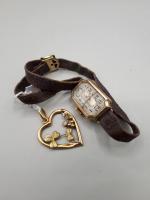 PENDENTIF en OR (chocs) et montre de dame OR bracelet cuir, poids brut : 9,1 g