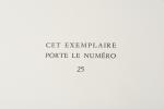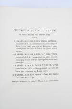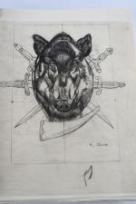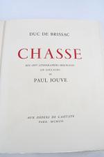 Un des 25 exemplaires sur vélin de Rives (n° 25) enrichi le beau et grand dessin original au crayon de la couverture, signé de Jouve, sur calque (trophée de sanglier) et une suite en bistre avec remarques de toutes les illustrations. Avec le bulletin de souscription.