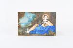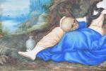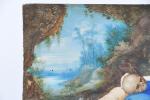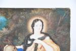 ECOLE FRANCAISE vers 1700. "Mademoiselle de La Vallière aux Carmélites", gouache sur vélin marouflée sur panneau. 16,5 x 25,5 cm. Indication manuscrite de l'époque au dos avec sujet et date 1674. (petits trous de vers)