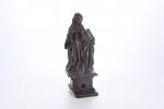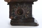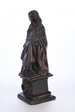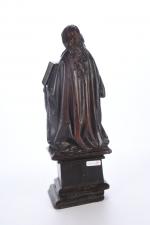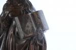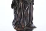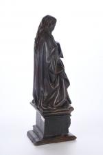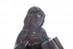 ECOLE BOURGUIGNONNE de la deuxième partie du XVe siècle. Reliquaire à sujet de Marie-Madeleine tenant les écritures. Noyer sculpté en ronde-bosse, traces de polychromie. H. 45 - L. 16 - P. 15,5 cm cm. (Manques le bras droit et au socle)