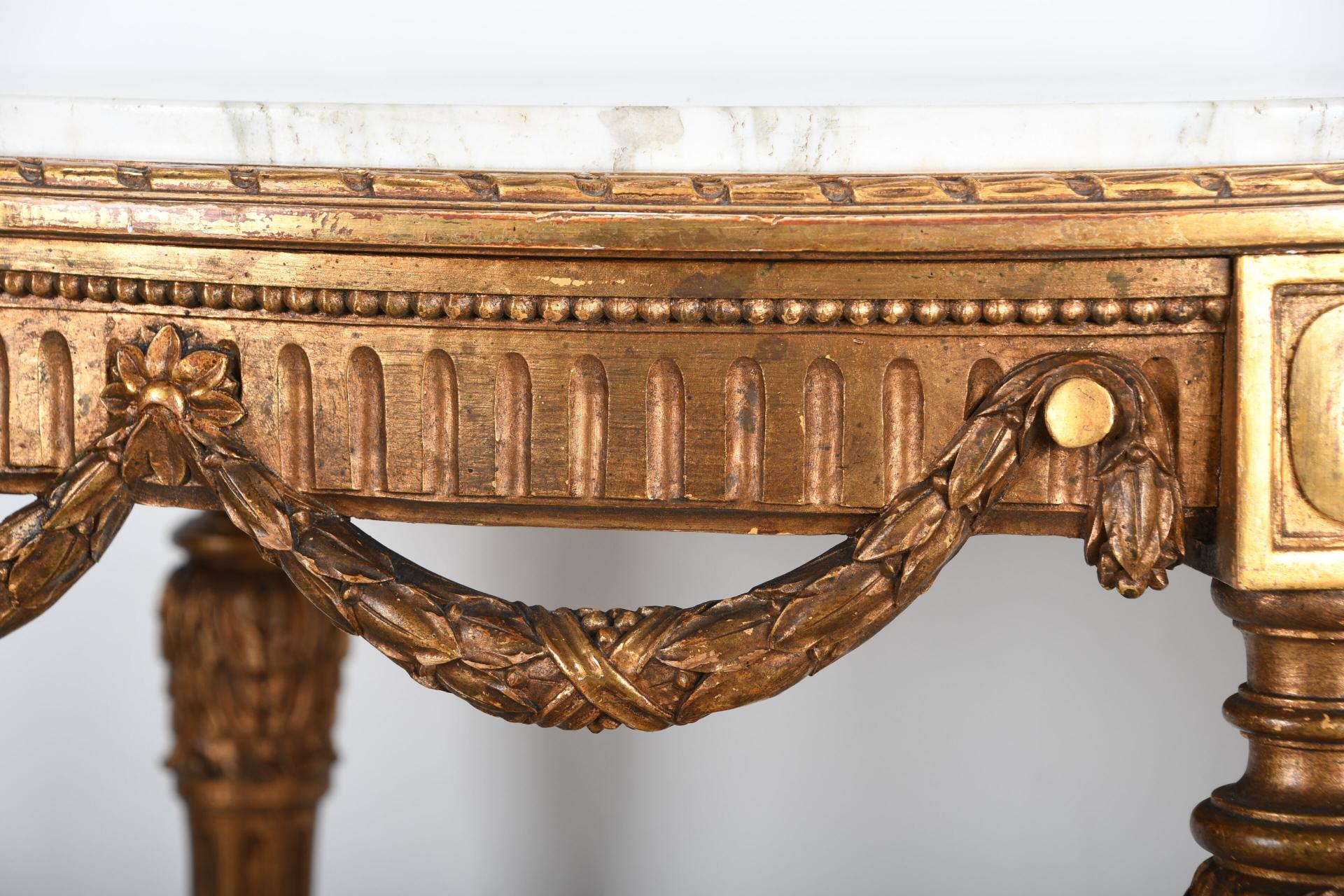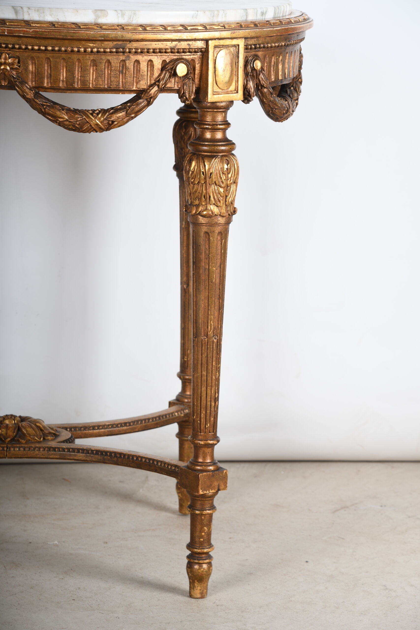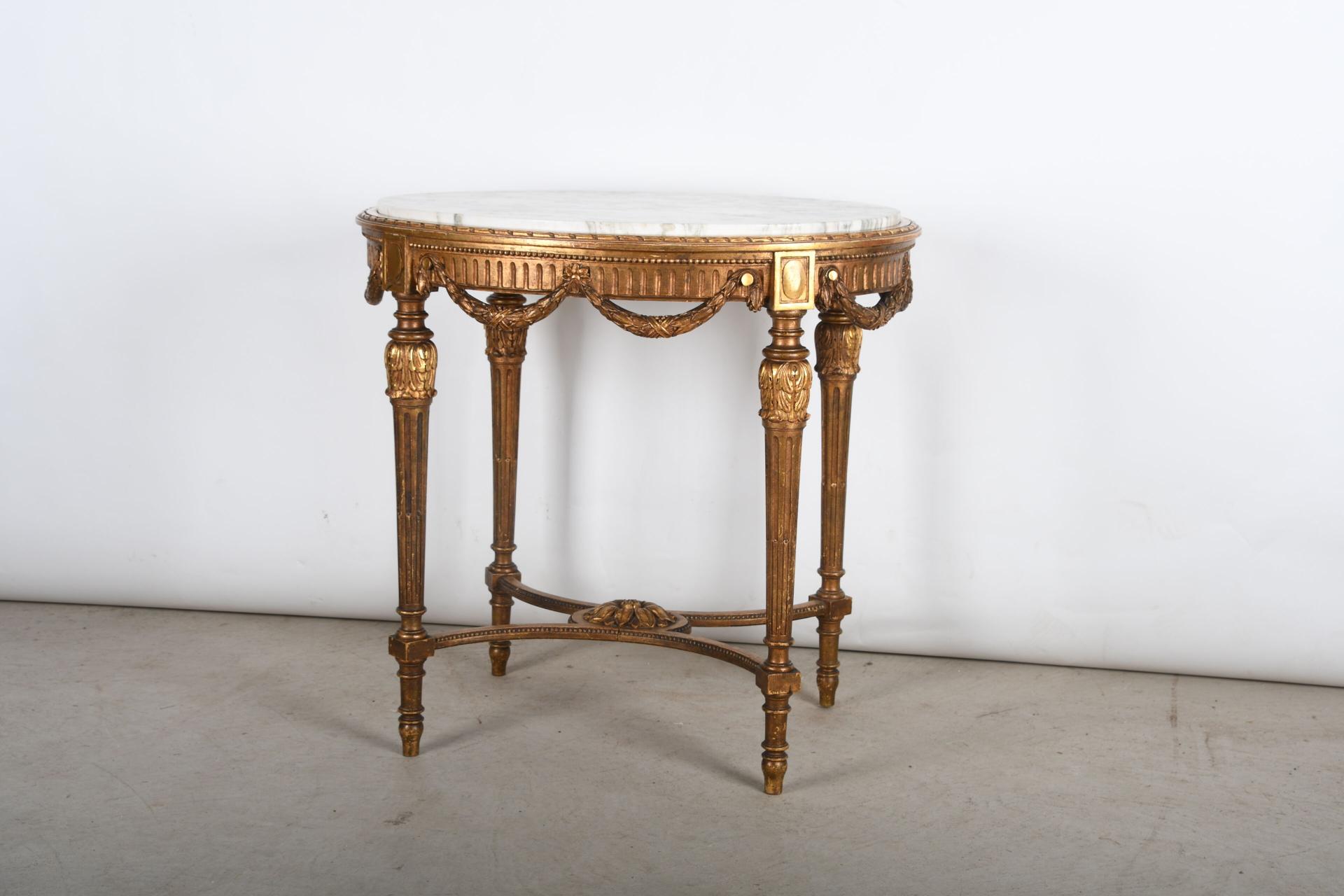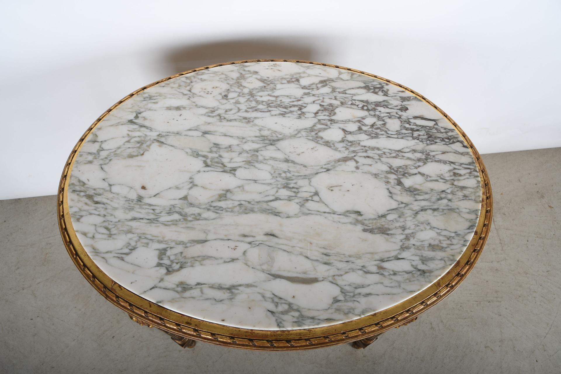 GUERIDON ovale en bois doré, pieds cannelés rudentés à entretoise en X et décor de guirlande de lauriers, plateau marbre blanc veiné. Style Louis XVI. H. 75 - L. 78,5 - P. 58 cm. (Un petit éclat en bordure).