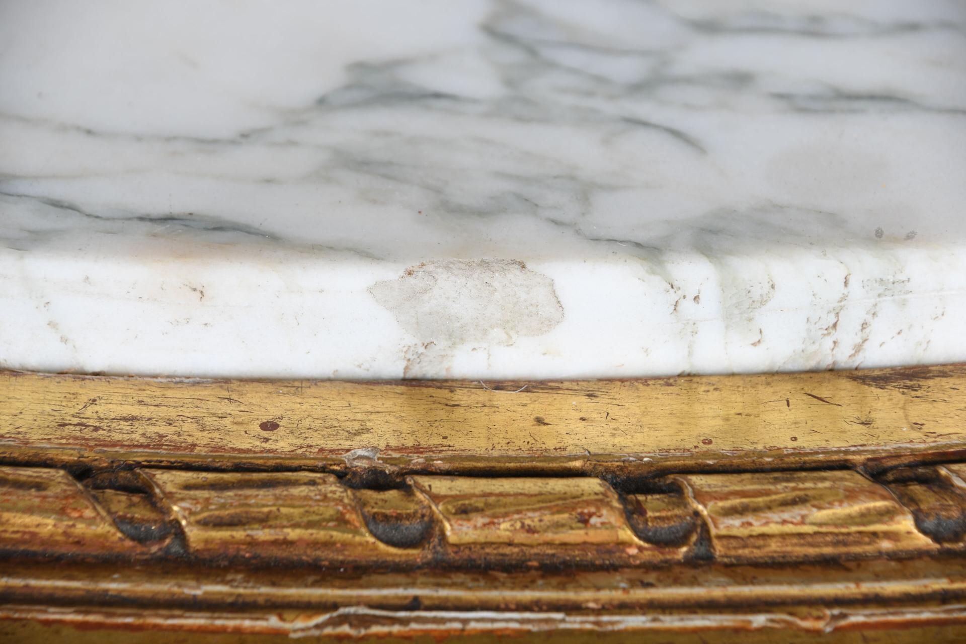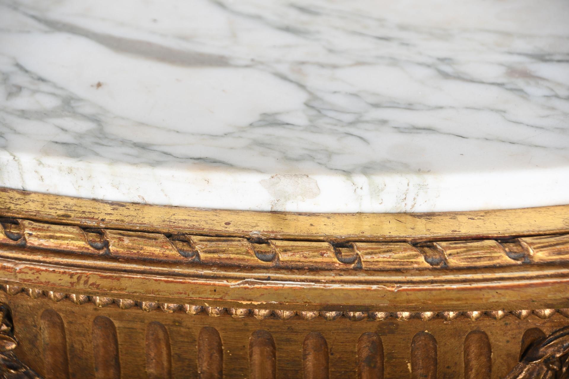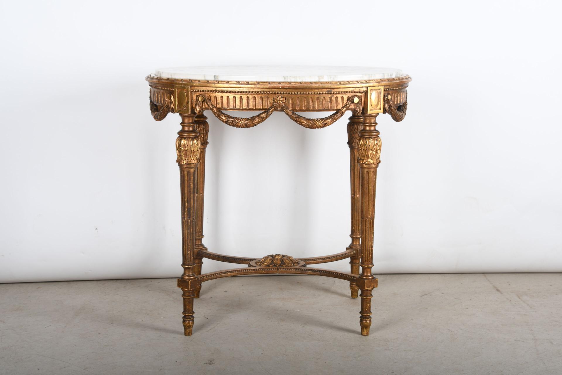 GUERIDON ovale en bois doré, pieds cannelés rudentés à entretoise en X et décor de guirlande de lauriers, plateau marbre blanc veiné. Style Louis XVI. H. 75 - L. 78,5 - P. 58 cm. (Un petit éclat en bordure).