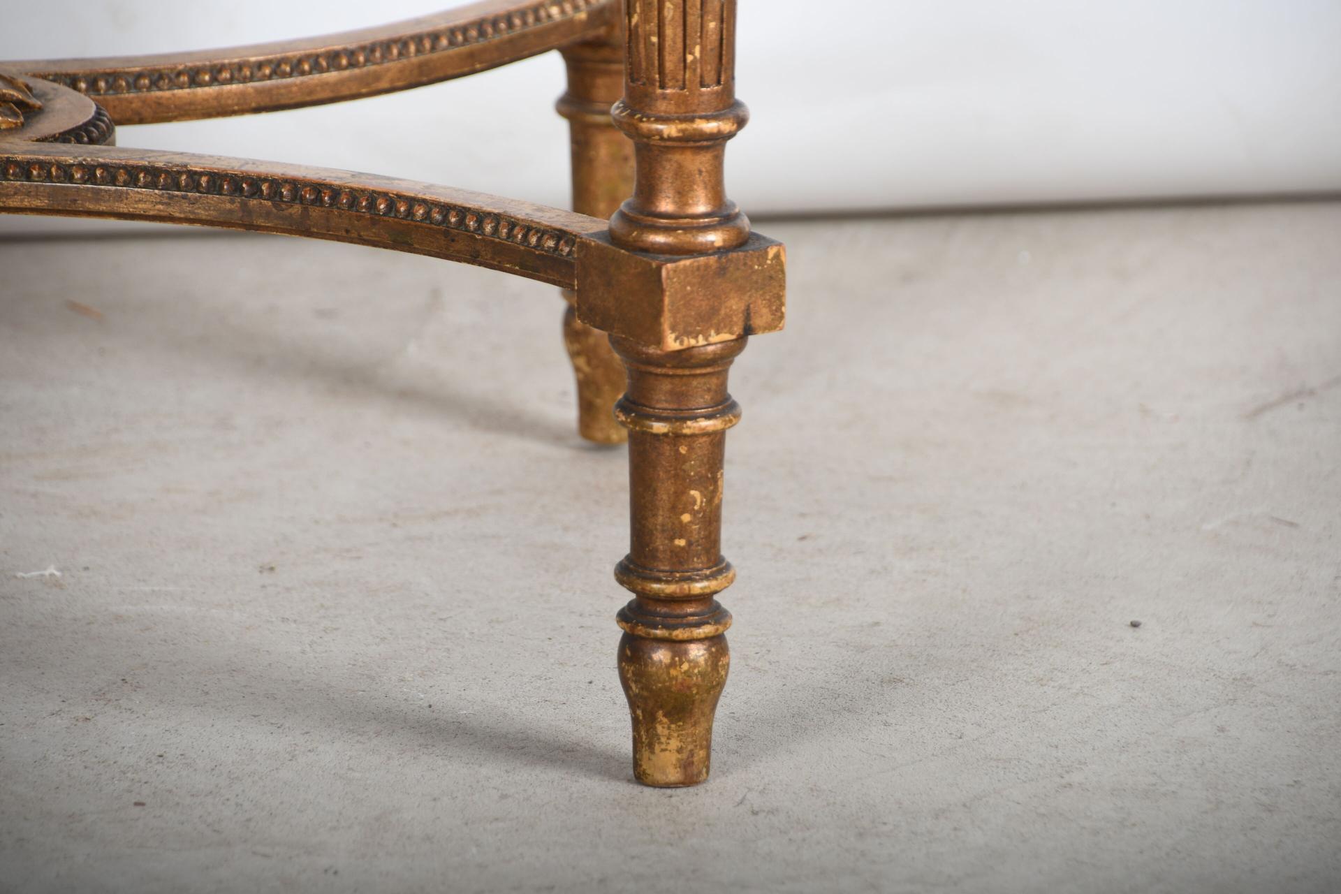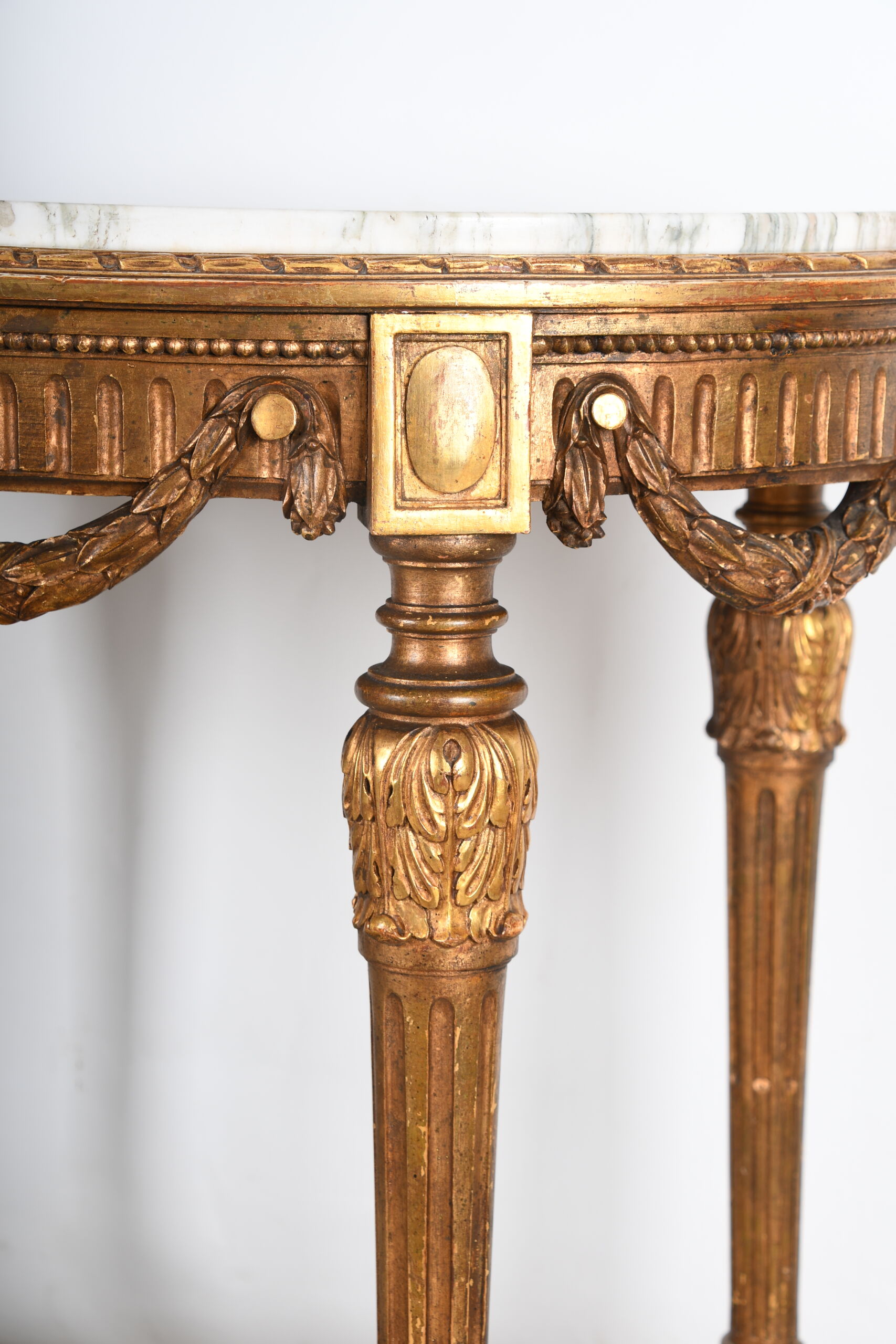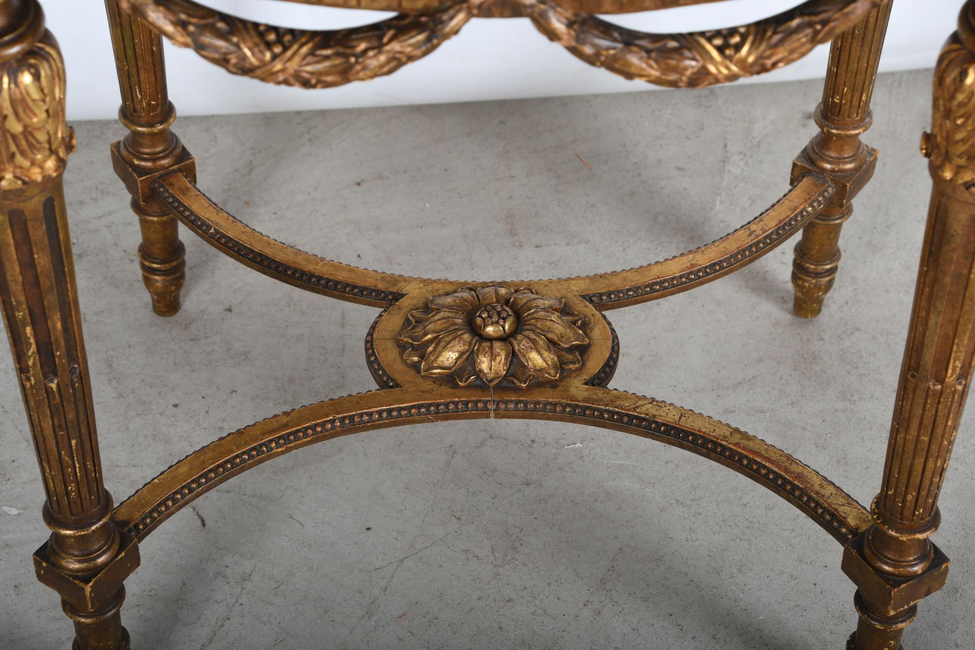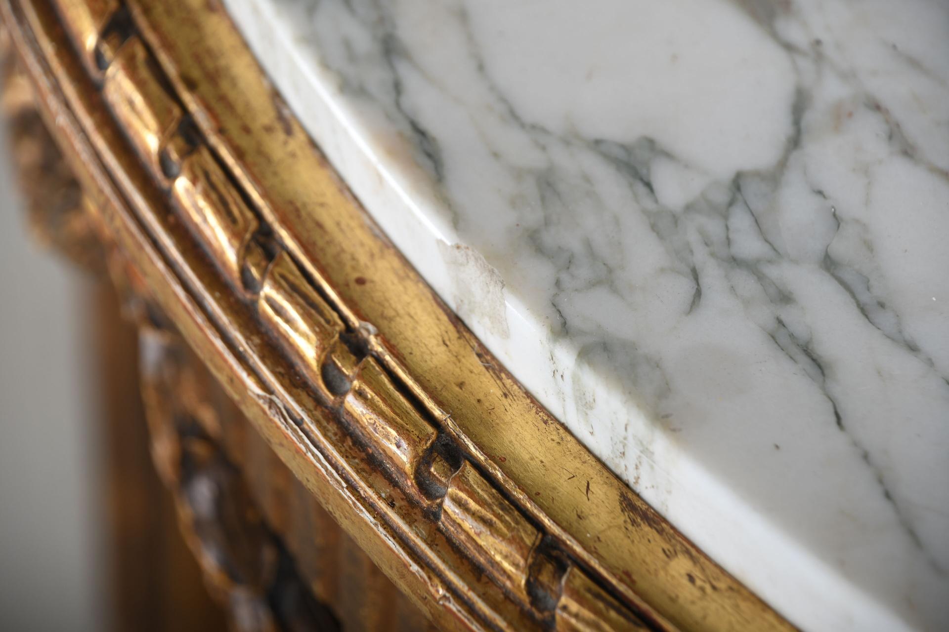 GUERIDON ovale en bois doré, pieds cannelés rudentés à entretoise en X et décor de guirlande de lauriers, plateau marbre blanc veiné. Style Louis XVI. H. 75 - L. 78,5 - P. 58 cm. (Un petit éclat en bordure).