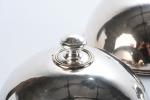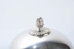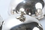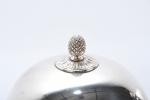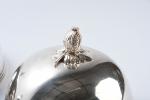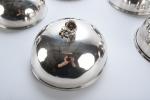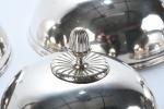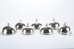 CLOCHES (lot de sept) dépareillées avec prises chantournées, fleurs et pommes de pin. Dont deux Christofle (petits chocs). H. de 12 à 17 cm.