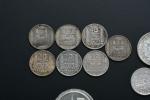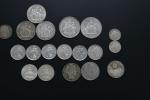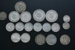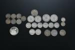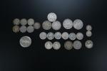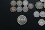 MONNAIES d'ARGENT (lot de 23) : 2 x 50 francs Hercule ; 3 x 10 francs Hercule ; 6 x 5 francs semeuse ; 2 x 1 francs semeuse ; 2 x 20 francs Turin ; 7 x 10 francs Turin ; 2 x 100 francs commémorative ; 1 x 10 deutsche Mark JOINT une MEDAILLE argent 999. Poids total : 392 g