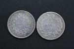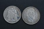 MONNAIES d'ARGENT (2) : 2 x écu : 5 francs 1834, atelier Limoges et 5 francs 1873, atelier Paris. Poids total : 50 g