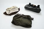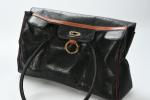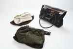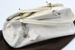 SAC à MAIN (suite de trois) dont marques : DONNIO Italy, Sac à main à toris compartiments, en cuir blanc embossé au monogramme de la marque, et métal chromé. Avec étui et étiquette d'origine. DAVIS JONES International : sac à main en cuir noir et bandes cognac, fermeture en métal doré. ALCHIMIA Italy, sac en toile, chaines et cuir.