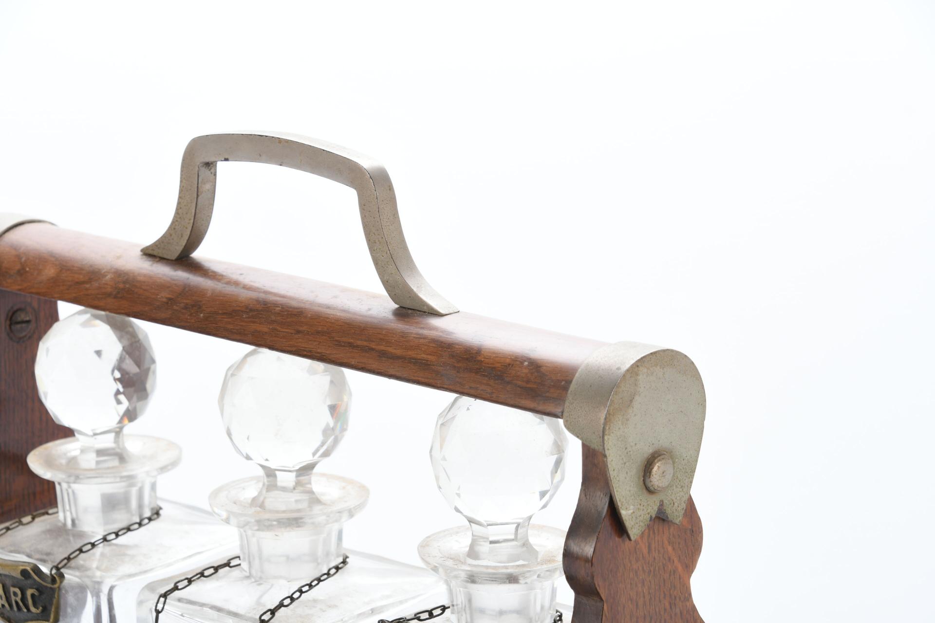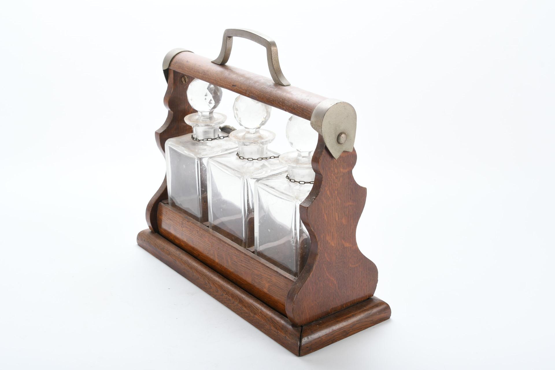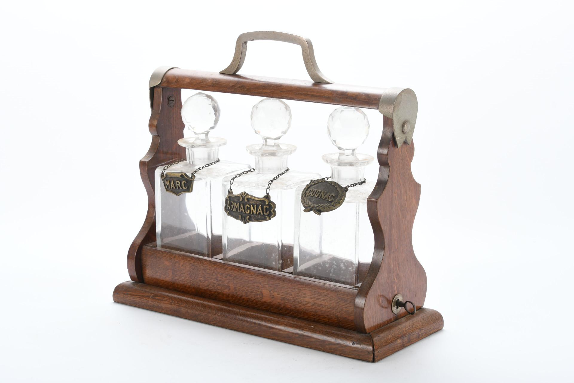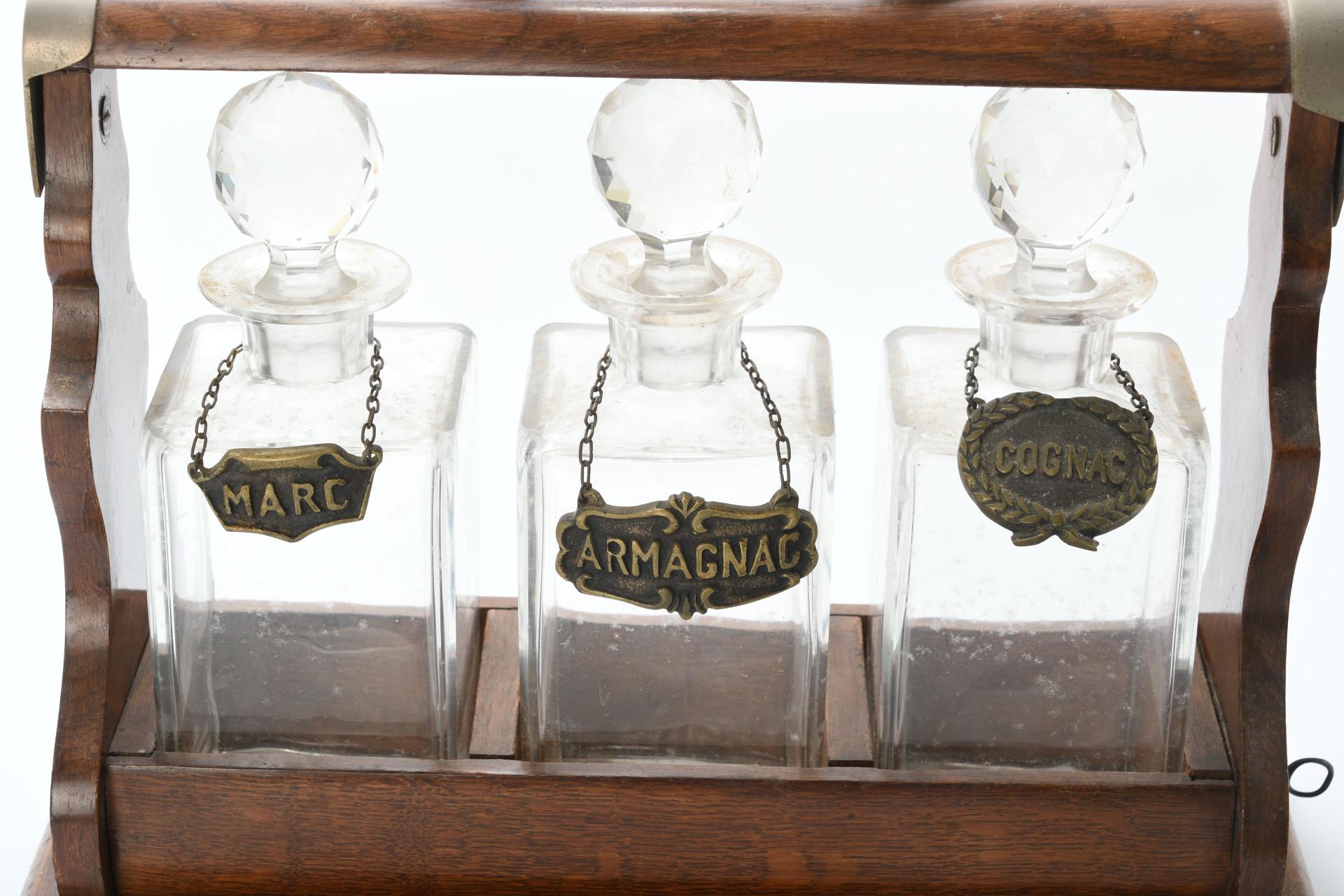 CAVE à whisky en chêne et métal avec trois carafes (l'une à col ébréché), base basculante, avec sa clef. H. 32,5 - L. 36 - P. 13 cm