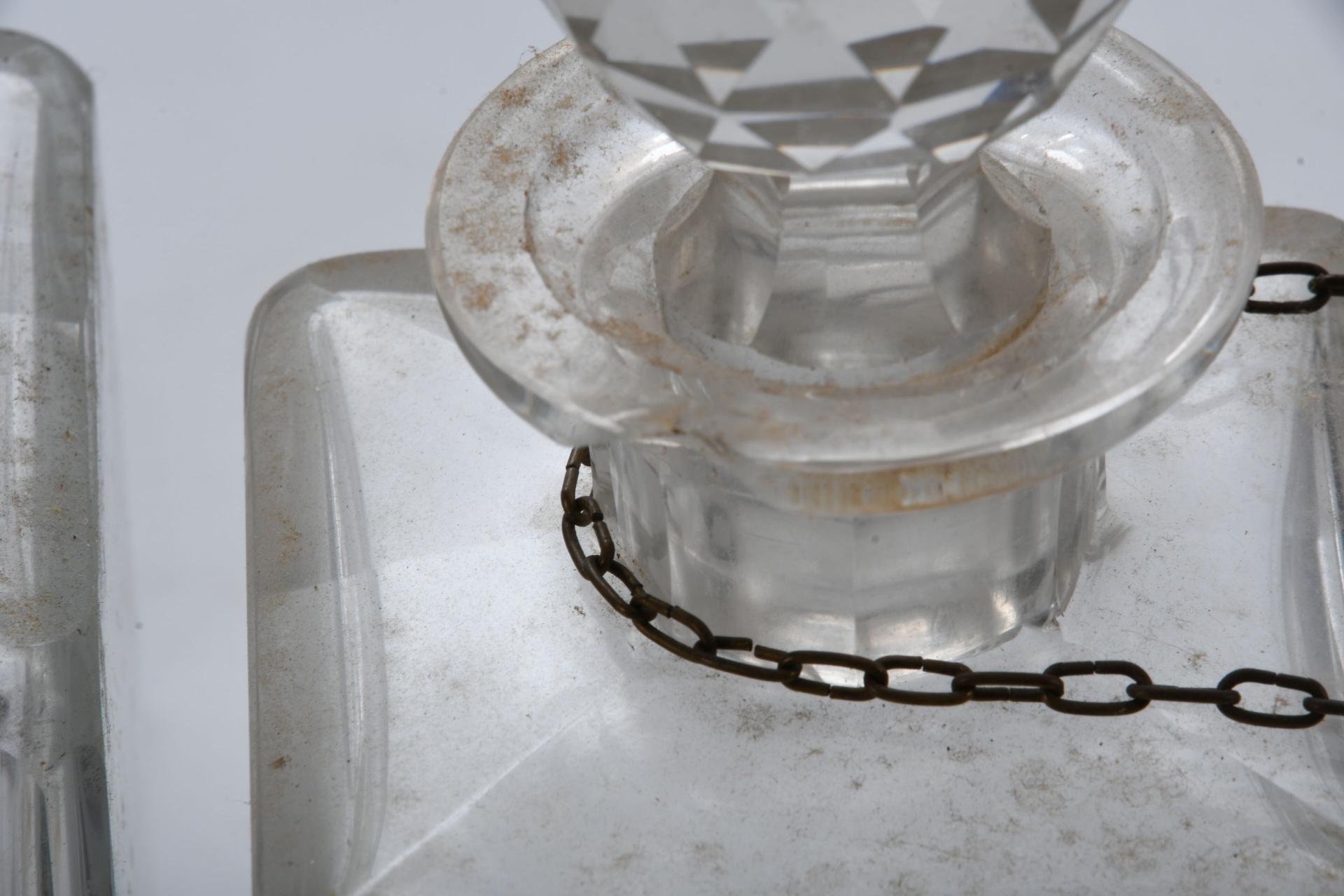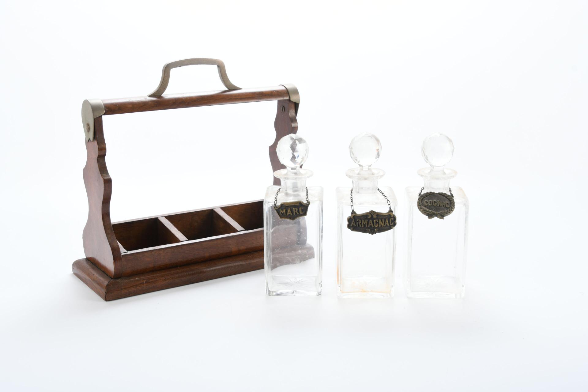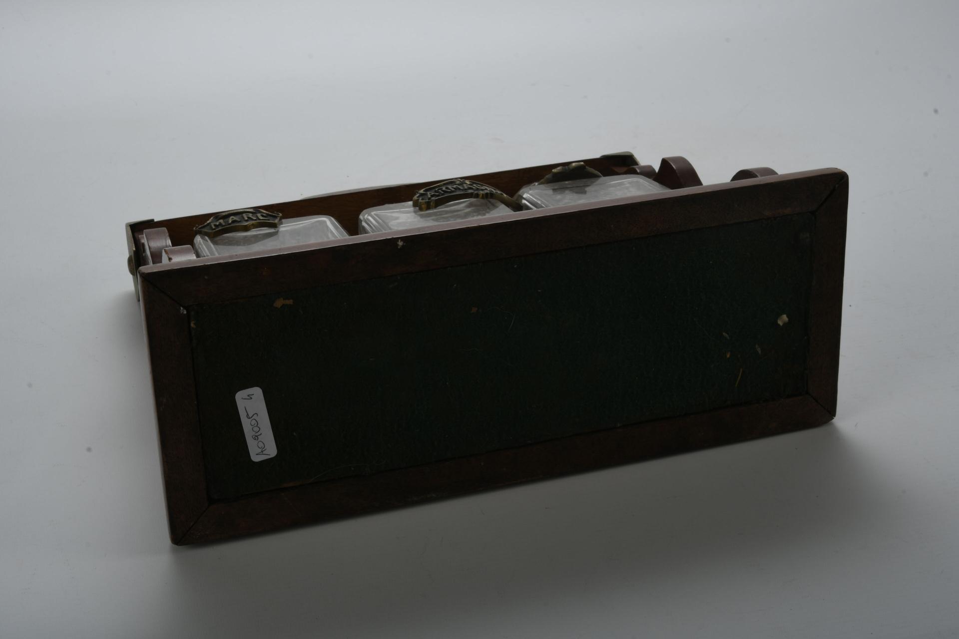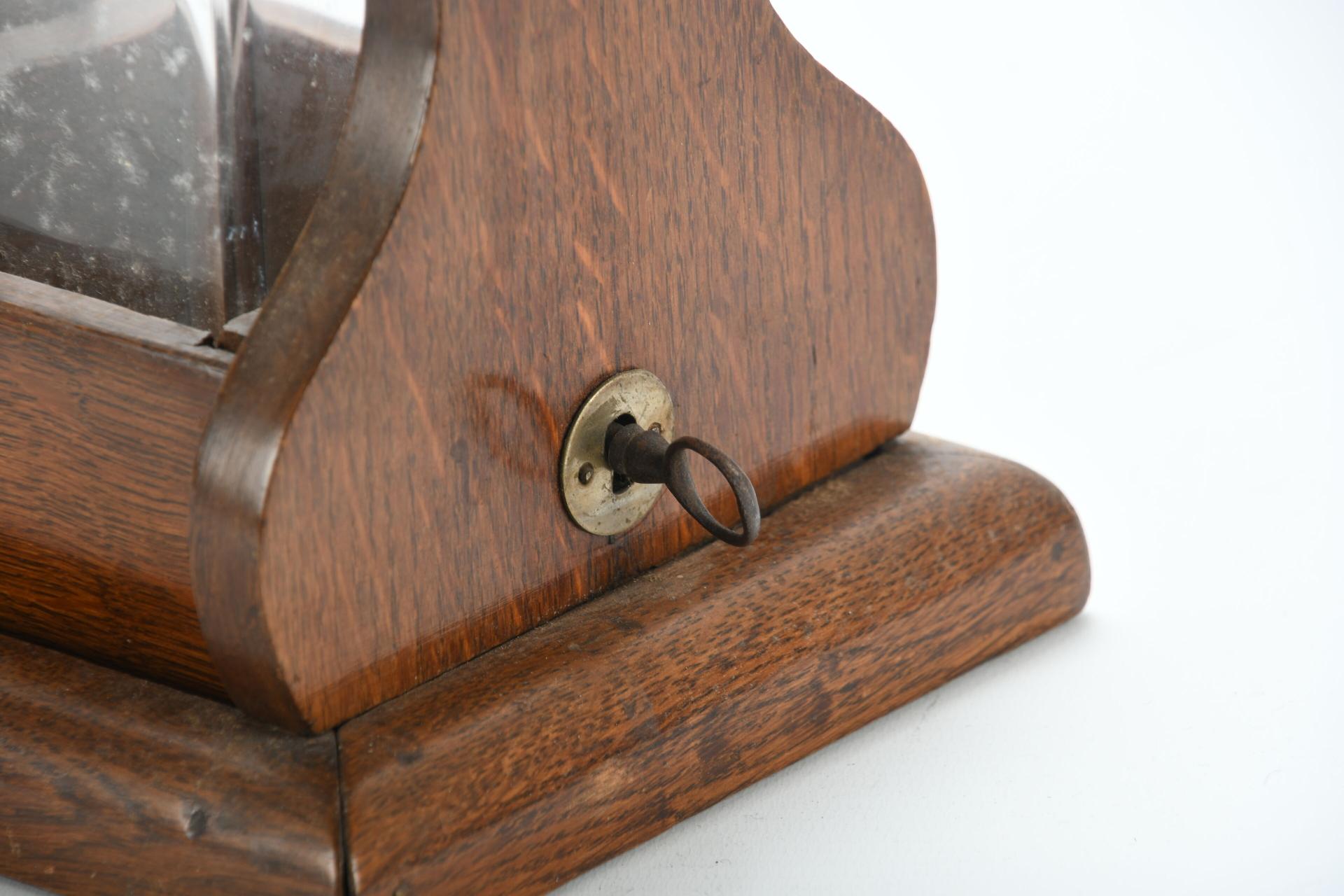 CAVE à whisky en chêne et métal avec trois carafes (l'une à col ébréché), base basculante, avec sa clef. H. 32,5 - L. 36 - P. 13 cm