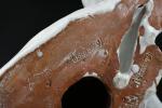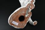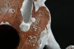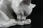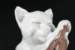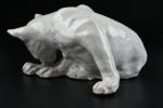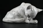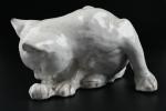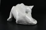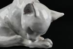 TUILERIE NORMANDE de BAVENT - Sculpture en terre cuite vernissée et émail blanc à sujet d'un chat se léchant la patte. Estampillé "TN Bavent" à plusieurs reprises au revers. H. 12 - L. 21 - P. 19 cm. Un petit manque d'émail à l'oreille droite.