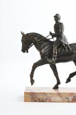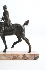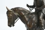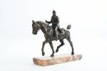 Gaston d'Illiers (1876-1932). "Cavalier Vernet" ou "Veneur", Bronze à patine brune signé sous le flanc du cheval. H : 23 L : 28 cm. Belle fonte ancienne du vivant de l'artiste.