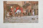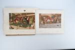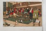Cecil ALDIN (1870-1935). "Three Jolly Huntsmen", Reproduction non encadrée à sujet de trois veneurs anglais, signature de l'artiste en bas à gauche, et titrée dans la marge. 30 x 40 cm (Usures et accidents tâches à la marge.) On y JOINT Une lithographie du même artiste "The hunt supper". 29 x 43 cm. (déchrirures, manques, non encadrée).