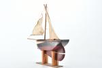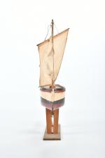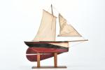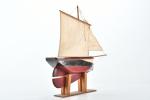 BATEAU JOUET de BASSIN naviguant en bois polychrome, toile de coton et ficelle. Figurant un voilier. Coque plombée. 45 x 50 cm. Usures d'usage, petits manques, quille fendue. Sur un socle en bois