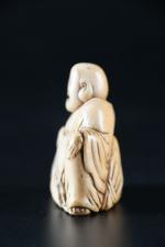 Netsuke en ivoire (Elephantidae SPP), Hotei assis, accoudé sur son sac de richesse. H. 4,9 - L. 5 cm