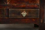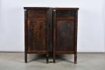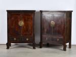 CHINE, XXème siècle, province du Hebei. Paire de cabinets bas en bois sculpté ouvrant à deux portes et deux tiroirs. H. 116 - L. 91 - P. 51,5 cm