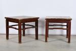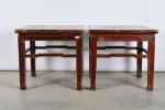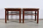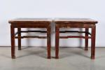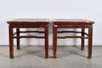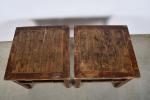 CHINE, fin du XIXème siècle, province du Shanxi. Paire de tables basses carrées en bois patiné. H. 56 - L. 61 - P. 61 cm