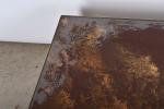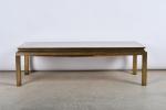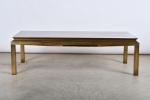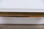 Table basse forme rectangulaire en laiton et verre églomisé couleur rouille à patine de rehauts dorés. Légèrement rehaussée dans une lingotière moulurée, sur quatre pieds section carré. H. 31 - L. 120,5 - P. 60 cm